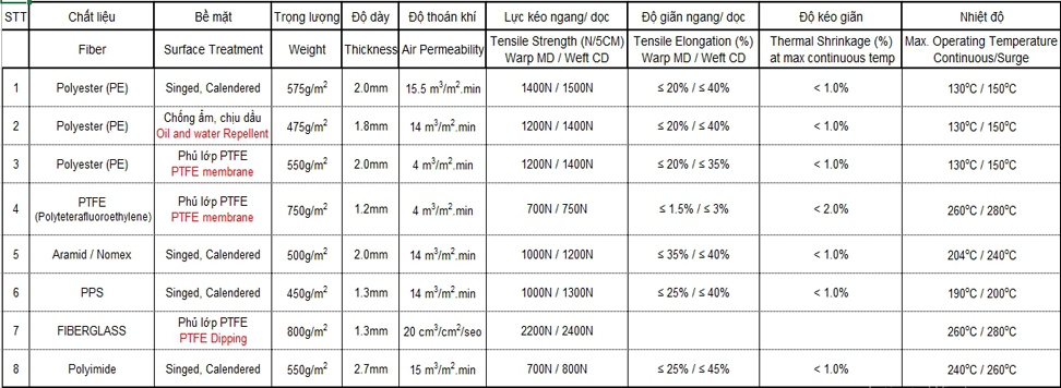 BẢNG THÔNG SỐ KỸ THUẬT TÚI LỌC BỤI